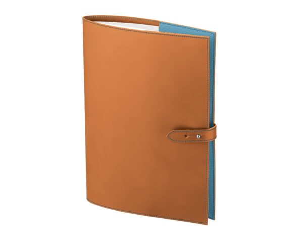 Liseuse A4 pour cahier en bi matière, cuir lisse à l’extérieur et grainé à l’intérieur. Elle se ferme par une patte avec bouton.