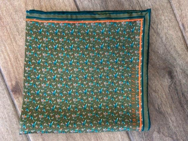 Pochette pour homme petits oiseaux vert olive de 40*40cm en twill de soie, double impression, finition roulotée main créer en collaboration la talentueuse Louis Groux – édition limitée-